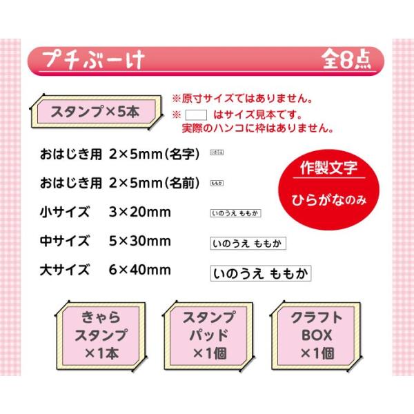 こちらは、お名前スタンプ5本にキャラスタンプ1本、おしゃれなクラフトボックス、インクパッドがついた8点セットです★