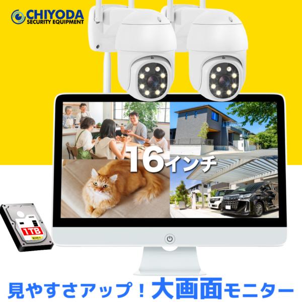 防犯カメラ 家庭用 屋外 工事不要 wifi PTZ 自動追尾 監視カメラ 屋内 2台セット 500万 セキュリティカメラ ワイヤレス モニター HDD1TB 最新16インチモニタ―