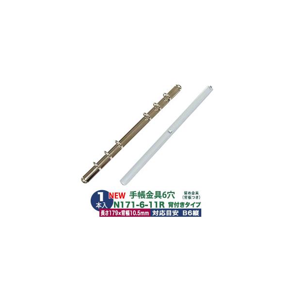 バインダー金具 N171-6-11R 1本入 長さ 179mm 背幅 10.5mm リング内径 11mm 背つきタイプ 6穴 シルバー ニッケルメッキ 鉄 B6縦 バイブルサイズ 取付 板付き