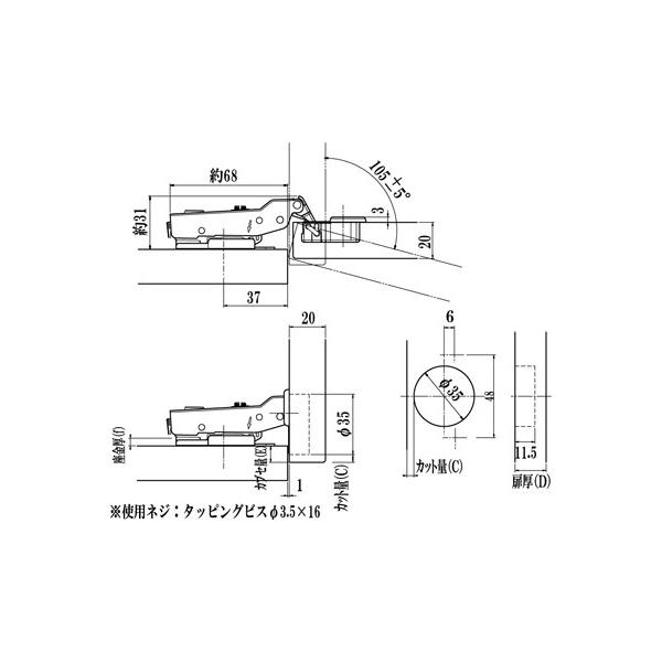 【在庫あり】DTC スライド丁番のみ C80B677T0 110°開き 半カブセ キャッチ付き ワンタッチタイプ C80シリーズ ※座金別売