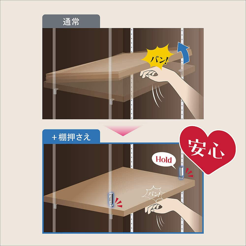 ●棚板を押さえ、跳ね上がりを防止するための部品です。