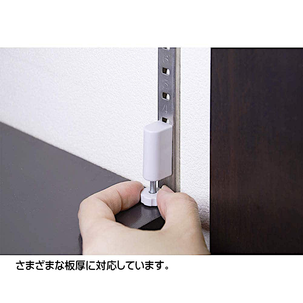 ●取り付け位置とねじ部の長さを変えることで、さまざまな棚板厚に対応可能です。
