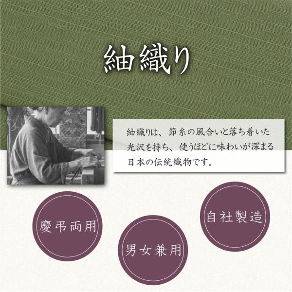 京都の老舗生地メーカーによる紬織り生地を使用し、職人の手で丁寧に仕立てた日本製のリバーシブルふくさです。節のある落ち着いた風合いと上品な光沢が特徴で、表と裏で異なる色を楽しめる仕様は、慶事・弔事どちらの場面にも対応。ふくさ本体だけでなく台の色も両面仕様となっており、用途に合わせた使い分けが可能です(実用新案登録済)。すべて自社工房にて、生地選びから裁断・縫製・仕上げまで一貫して行っており、品質にこだわる方にも安心してお選びいただけます。初めての方にもわかりやすい「ふくさノート」と「金封包表書き諸例」付き。カラーは〈紺×紅葉〉〈老緑×紅葉〉〈古代紫×紺〉の3種をご用意しました。