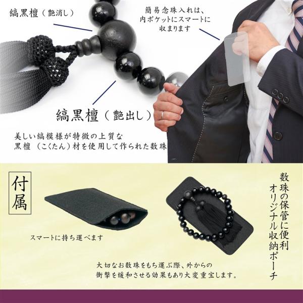 この京都製の縞黒檀念珠は、葬儀や法事、お通夜、お墓参りなど、あらゆる宗派でお使いいただける略式念珠です。縞黒檀は、心を静める美しい仏具として信仰を深めることができ、四国お遍路のお供にも最適です。この縞黒檀念珠は、念珠製造師の匠の技で仕立てられ、逸品としての価値を持っています。さらに、簡易数珠入れも付属しており、大切な数珠を保管する際に便利です。天然の黒檀を使用しているため、色味の違いが個々にあります。ご了承ください。 商品仕様は以下の通りです。