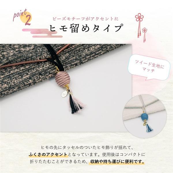 この商品は、ツイード生地を使用した紐留めタイプのおしゃれな慶事用ふくさです。特にお祝いの場にぴったりの袱紗としてご利用いただけます。このふくさは、上品なベージュとブラックの2色がおちついた色合いで、落ち着いた雰囲気を演出します。柔らかな色合いと織り柄が上品で、内布には光沢のある質感があり、高級感を感じさせます。紐留めの仕様により、ソフトタイプでありながら祝儀袋に合わせて調整することができます。紐の先にはビーズモチーフがアクセントとなり、さりげない華やかさを添えています。また、使用後にはコンパクトに折り畳むことができるので、収納や持ち運びにも便利です。この商品は、ツイード生地の上品さと細部にまでこだわったデザインが特徴です。大切な慶事の際には、ふくさとしての優れた機能性とおしゃれさを兼ね備えたこのアイテムをお使いいただければと思います。