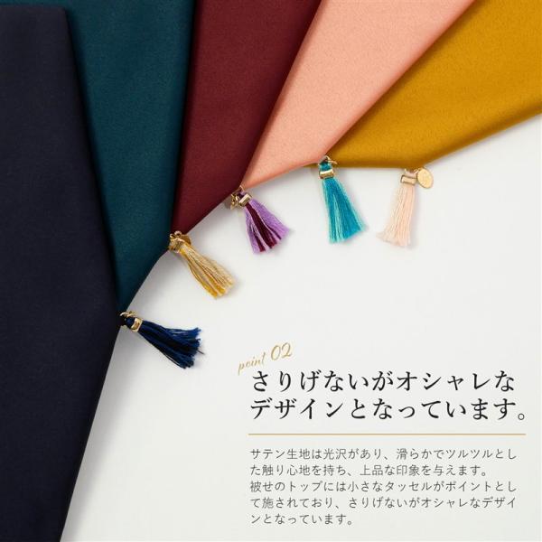 「ミニタッセルふくさ(スリッド型)」は、華やかさと豪華さを演出するバイカラーのサテン生地を使用した、お祝いごとや結婚式などの慶事用にぴったりのアイテムです。特長として、サテン生地は光沢があり、滑らかでツルツルとした触り心地を持ち、上品な印象を与えます。被せのトップには小さなタッセルがポイントとして施されており、さりげないがオシャレなデザインとなっています。また、金封の出し入れが簡単に行えるよう、中のポケットがスリット型になっています。厚みのある芯材を使用しているため、ふんわりとしたクッション性があり、大切な金封をしっかりと守ります。ミニタッセルふくさは、お祝いの席や特別なシーンにふさわしいエレガントな雰囲気を演出し、大切な贈り物やお金を包む際に重宝するアイテムです。