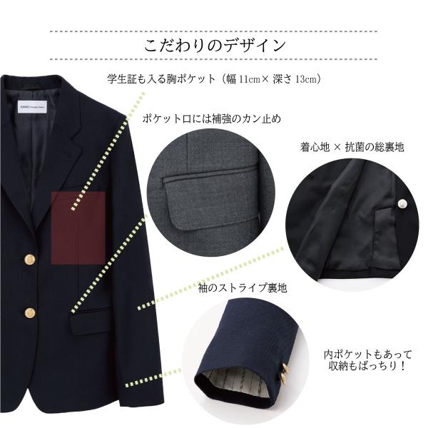 ●特長:定番のスクールブレザーです。ご家庭で洗濯可能なイージーケア性、生地や縫製の耐久性など、こだわりがたくさん詰まったブレザーです。袖口からチラリと見えるストライプの裏地やこだわりのボタンでシンプルな中にもアクセントをプラス。定番のデザインとカラーは着回ししやすく、毎日の通学に活躍してくれます。