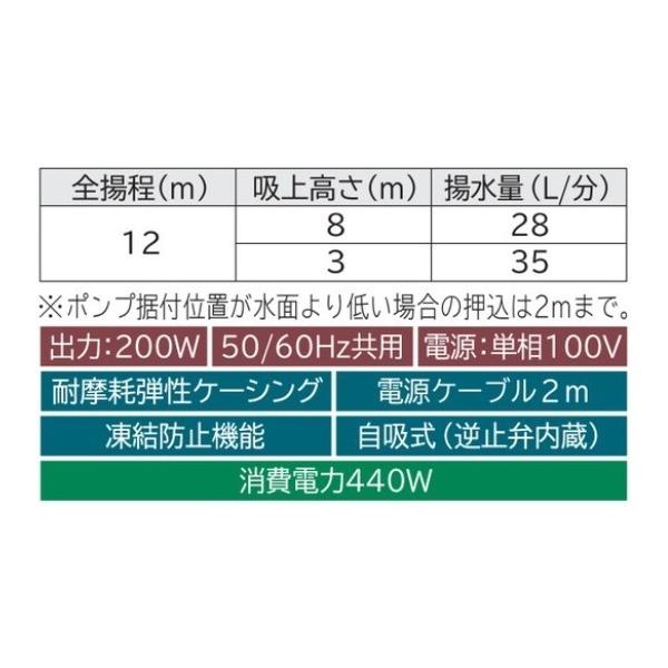 主な特長:●出力:200W●吸上高さ:8mまで●揚水量(全揚程12m時):28L/分(吸上高さ8m)、35L/分(吸上高さ3m)●単相:100V