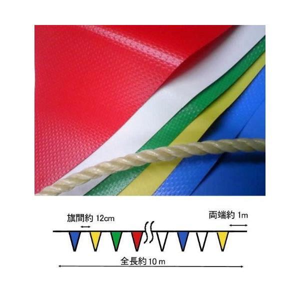 【三角部分は約27X34cm・全長約10m(ロープ含む) 】【素材:旗部分・ターポリン / ロープ部分・PPロープ】■三角部分20枚 *ターポリン素材とは、ポリ繊維を軟質合成樹脂フィルムで挟んだ、テントや建設現場・野外広告に使用される素材で耐久性の優れた素材です旗のサイズ・色・並び等若干変わる場合がございます