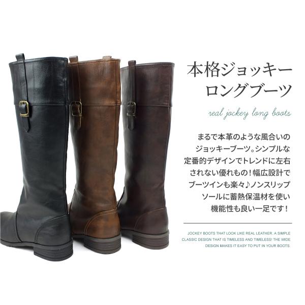 4)その他商品説明:シンプルな定番的ベルトデザインでトレンドに左右されないジョッキーブーツ。まるで本革のような風合いで上品な仕上がり!艶やかなフェイクレザーはとても柔らかく、足の動きに合わせて優しくフィットしますので履き心地が良く歩きやすくなっています!無駄がなくとてもシンプルなデザインなのでスタイルを選ばずどんなコーディネートにも合わせられます♪幅広設計でブーツインも楽々♪ノンスリップソールに蓄熱保温材を使い機能性UP!