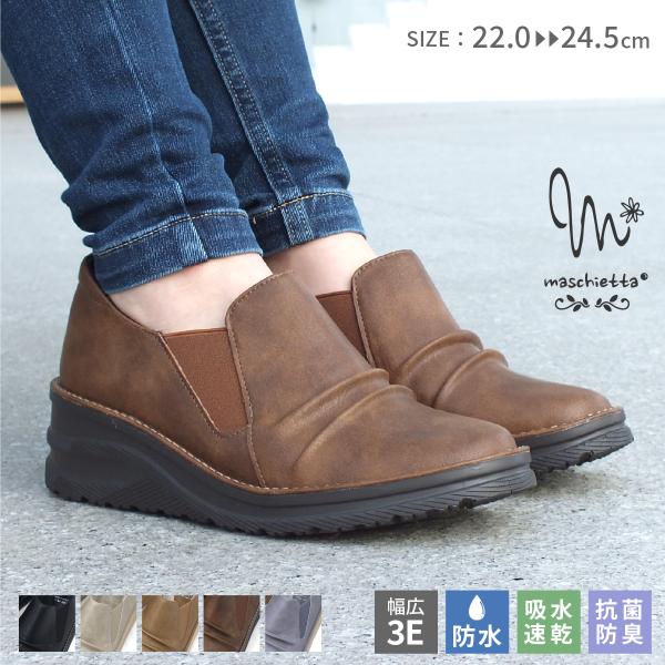 maschietta マスチェッタ スリッポン カジュアルシューズ 防水 ギャザー コンフォート 厚底 ウェッジソール 3E 幅広 吸水 速乾 抗菌 防臭 屈曲 レディース 爆買