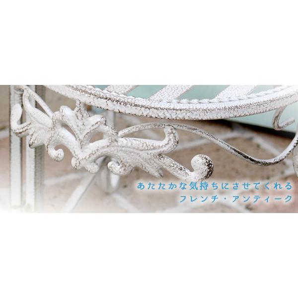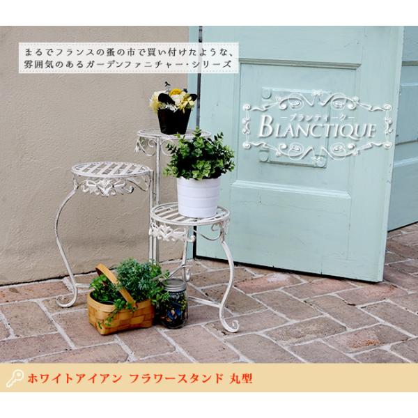【ブランティーク ホワイトアイアンフラワースタンド 丸型】まるでフランスの蚤の市で買い付けたような、雰囲気のあるガーデンファニチャー・シリーズ あたたかな気持ちにさせてくれるフレンチ・アンティーク フランス語で「白」を意味する「ブラン」に、アンティークな魅力をプラスしたシリーズ、「ブランティーク」。なじみやすい清潔感のあるオフホワイトと、気品あるシャビー感が絶妙にミックスされ、お庭やベランダ、バルコニーの雰囲気を味わい深いものにしてくれます。シリーズで揃えられるので、統一感のあるガーデンコーナーが作れます。シャビーなインテリアに興味があるけれど、どこから手をつけていいかわからない・・・ という方にも気軽に楽しんで頂けます。ひとつ置くだけで、まるでフランスの郊外のような雰囲気に時を忘れる・・・。そんなデザイン性の高い「ブランティーク」シリーズなら、オブジェを兼ねたガーデンアイテムとして長く愛されることでしょう。