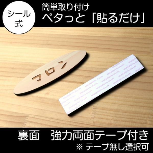 詳細:国産ヒノキにレーザーにて刻印しています。ベース板の側面はレーザーカットにて炭化(黒色)し独特の雰囲気があります。裏面には強力な両面テープが標準で加工してあり、ツルツルで平らな面への取り付けは、貼り付けて圧着するだけです。ザラザラ、凸凹面への取り付けはボンド固定がオススメです。
