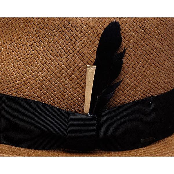 ムラ感のあるパナマ帽体に太目なリボン&黒の羽根飾り、金属製のピンがアンティークな印象を強めています。(羽根飾り・ピンは糊付けされていて取り外しはできません)