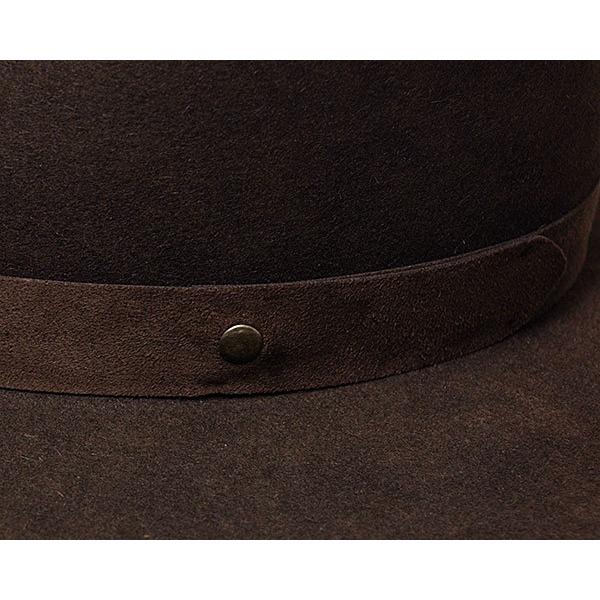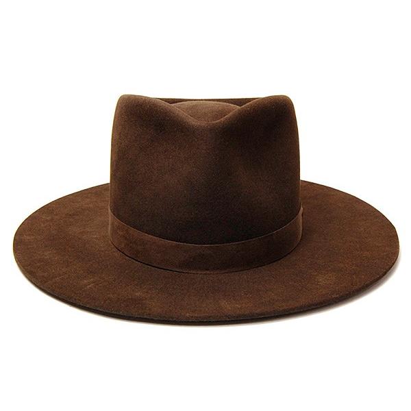 ウエスタンハットに使う厚手のラビットファーフエルトをつかって硬く仕上げているので、つばのゆがみが無くシャープなシルエットのままでかぶれます。アンティークの型で作られたクラウンはカーブラインが非常に美しく