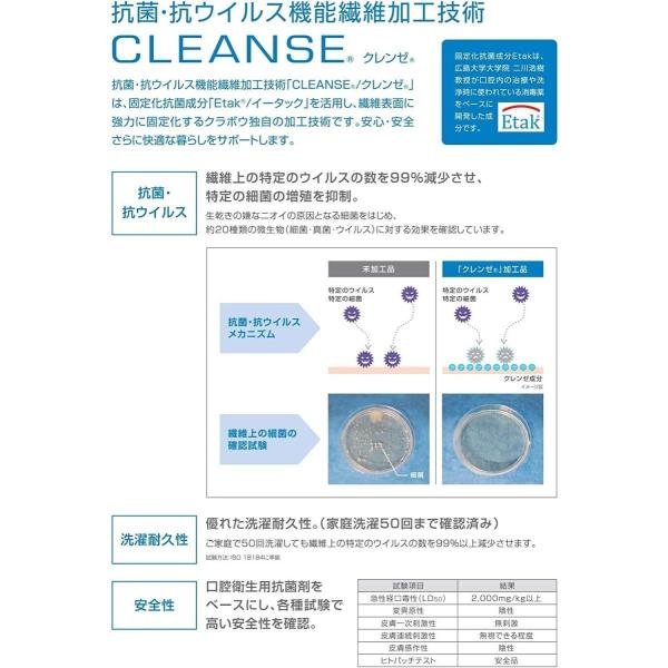 抗ウイルス機能繊維加工技術「CLEANSE/クレンゼ」は、固定化抗菌成分「Etak/イータック」を活用し、繊維表面に強力に固定化するクラボウ独自の加工技術です。 繊維状の特定のウイルスの数を99%以上減少させます。 洗濯耐久性にも優れた素材で、洗濯50回でも効果が持続します。 ブロードは平織り薄手の定番素材。T/C(ポリエステル/綿)なのでシワになりにくく縮みにくい、また薄さのわりにハリのある風合いです。