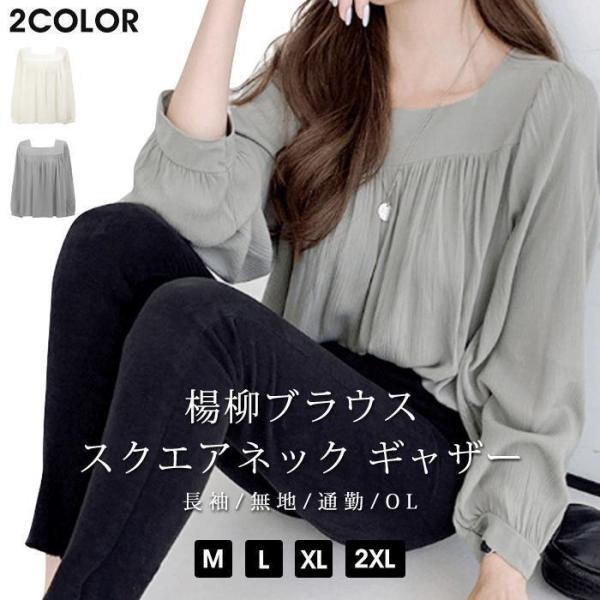 ブラウス レディース シャツ スクエアネック プルオーバー ギャザー 長袖 無地 楊柳ブラウス トップス 通勤 OL オシャレ 大人
