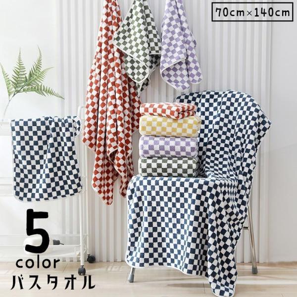 バスタオル 大判タオル バス用品 バスグッズ 日用品雑貨 吸水タオル 70cm 140cm チェック 格子柄 シンプル ループ付き 吊り下げ やわらか