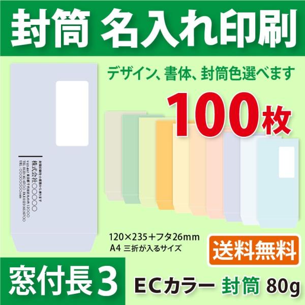 封筒作成 窓付き 長3 ECカラー封筒に黒1色で名入れ印刷 100枚 長形3号 封筒代込み 厚さ80g 標準配送料込み