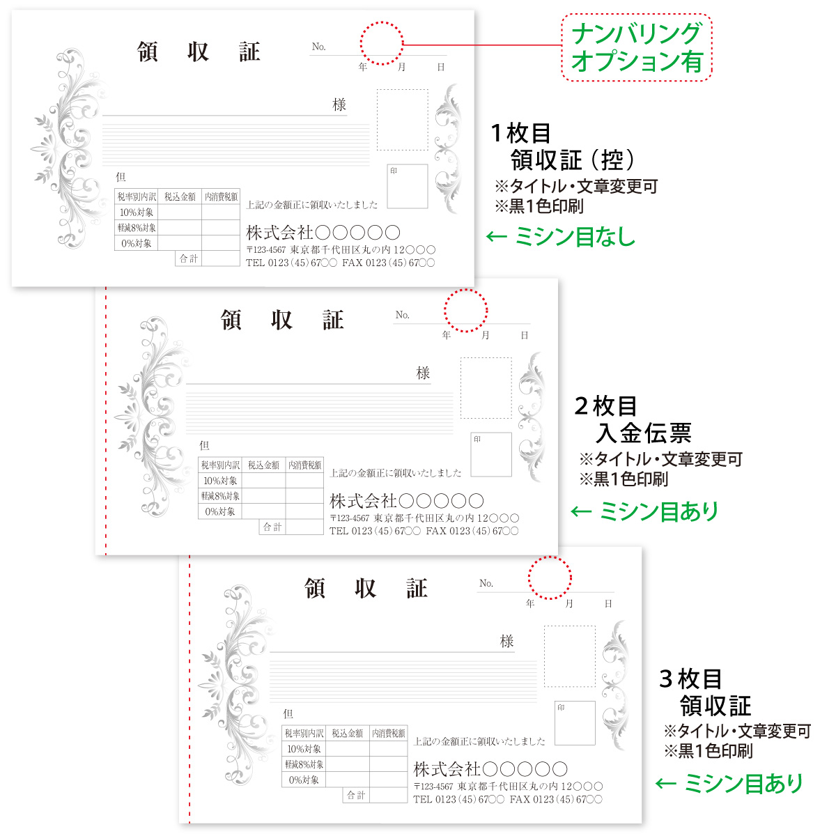 ●内容 : オリジナル名入れ印刷で作る、3枚複写の領収証(領収書)