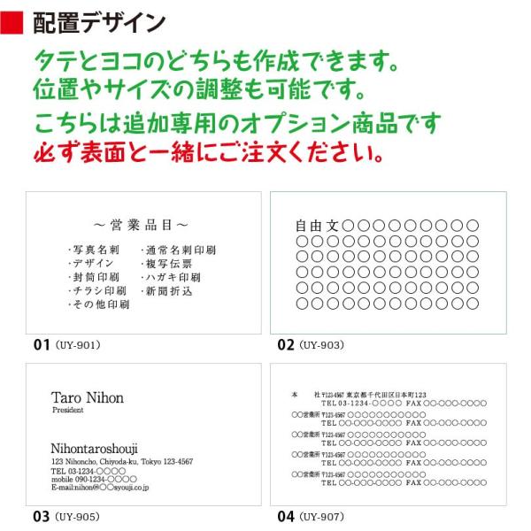 ●内容 : こちらは名刺の裏面にモノクロ印刷を追加するオプション商品です。必ず表面と同時にご注文ください。