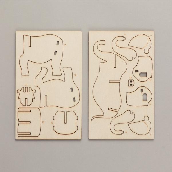 レーザーカット済みのパーツを順番に差し込むだけで組み立てられる、簡単で楽しい木製3Dパズルです。立体なので、ゾウの迫力のあるシルエットを再現できます。工具不要で手軽につくれるので、初心者でも扱いやすい商品です。木の温かみがあり、作ったあとはインテリアとしても飾れるため、工作にも鑑賞にもぴったり。組立時間約20分で気軽に楽しめるので、ワークショップやイベントの集客アイテムとしても活躍します。種類も豊富なので、集めて並べても楽しい3Dパズルシリーズです。