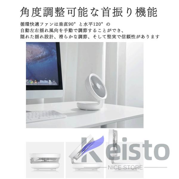 【首振り機能、リモコン操作】左右180度回転+手動で上下90度調節ができ、様々な角度から風を部屋の隅々まで届けることができます。付属のリモコンを使用すると、ベッドやソファの上でも操作でき、風量の調整、回転の制御、アンビエントライトのオン/オフ、タイマーの設定ができます。