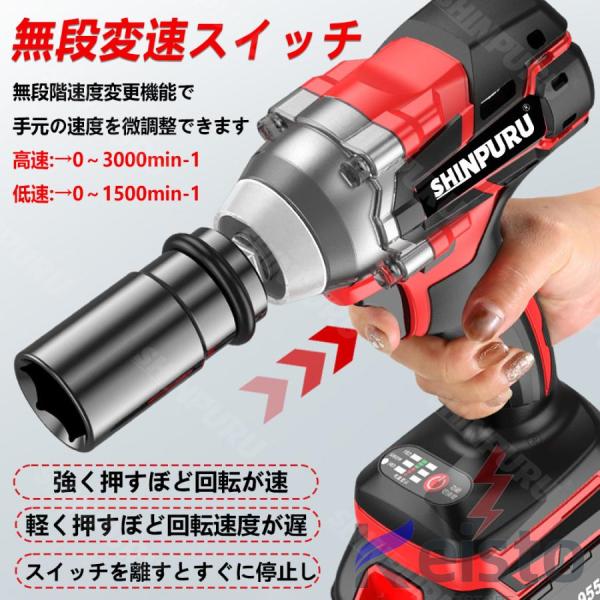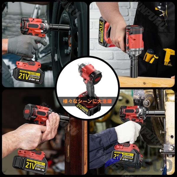 【ブラシレスモーター】高出力のブラシレスモーターを使用しており、企画上ではフル充電の時、最大トルクは780N.m、回転速度0-3000rpm(min-1)に達し、空振り回転数は4200r/minです。ナットをやさしく緩め、不正交換が可能です。タイヤ交換に対応可能です。