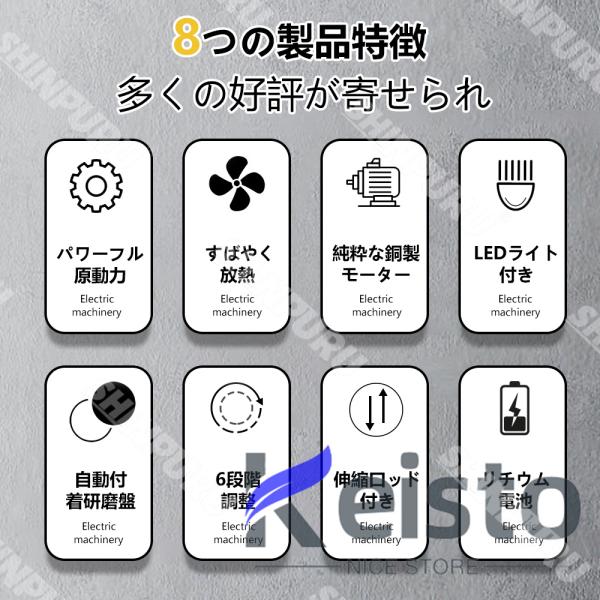 高所で作業する必要がある場合は、付属の延長ロッド アクセサリを使用してください。 かがむ必要がなく、腰への負担を軽減。 快適なグリップのための人間工学に基づいた滑り止めハンドル。 両手操作で作業疲労を軽減し、作業スピードアップ。三段伸縮、伸縮距離60-180CM。
