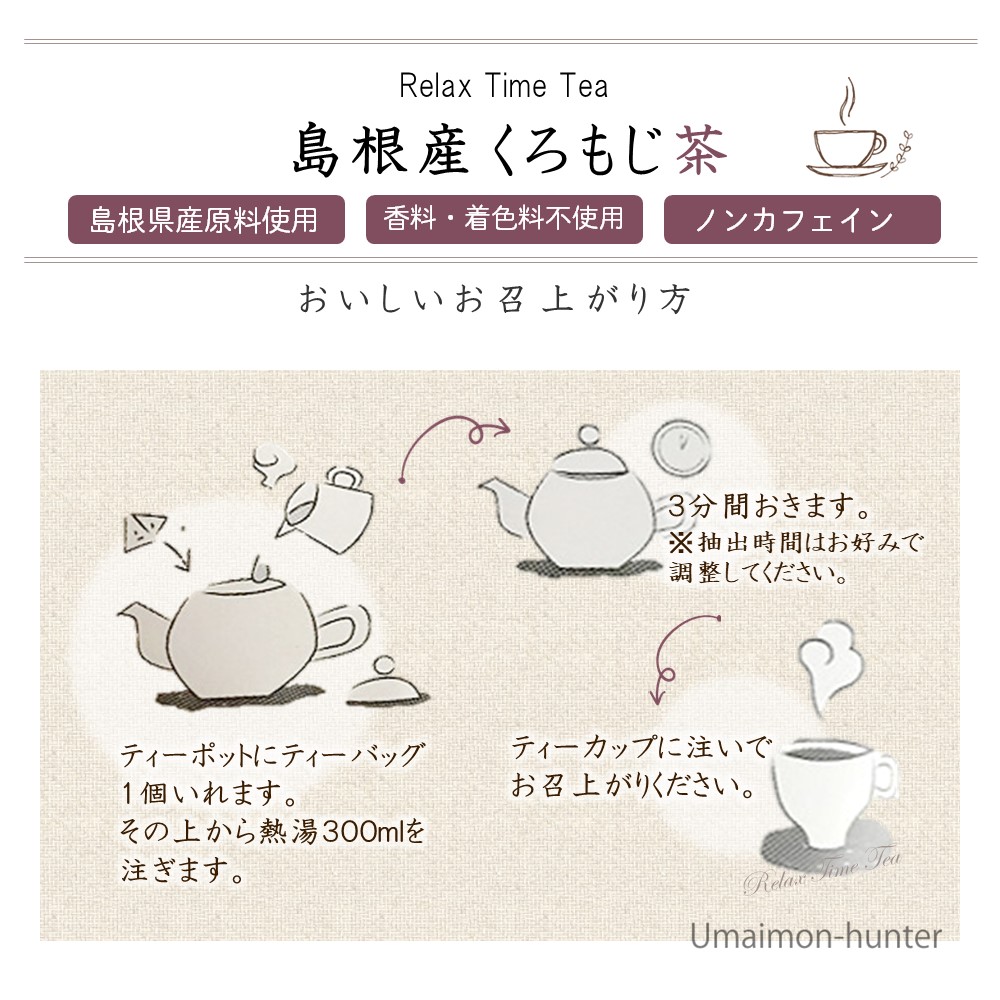 【名称】くろもじ茶【内容量】2g×6P入×2袋【賞味期限】製造日より 365日 ※未開封時【保存方法】直射日光・高温・多湿を避け移り香にご注意下さい。