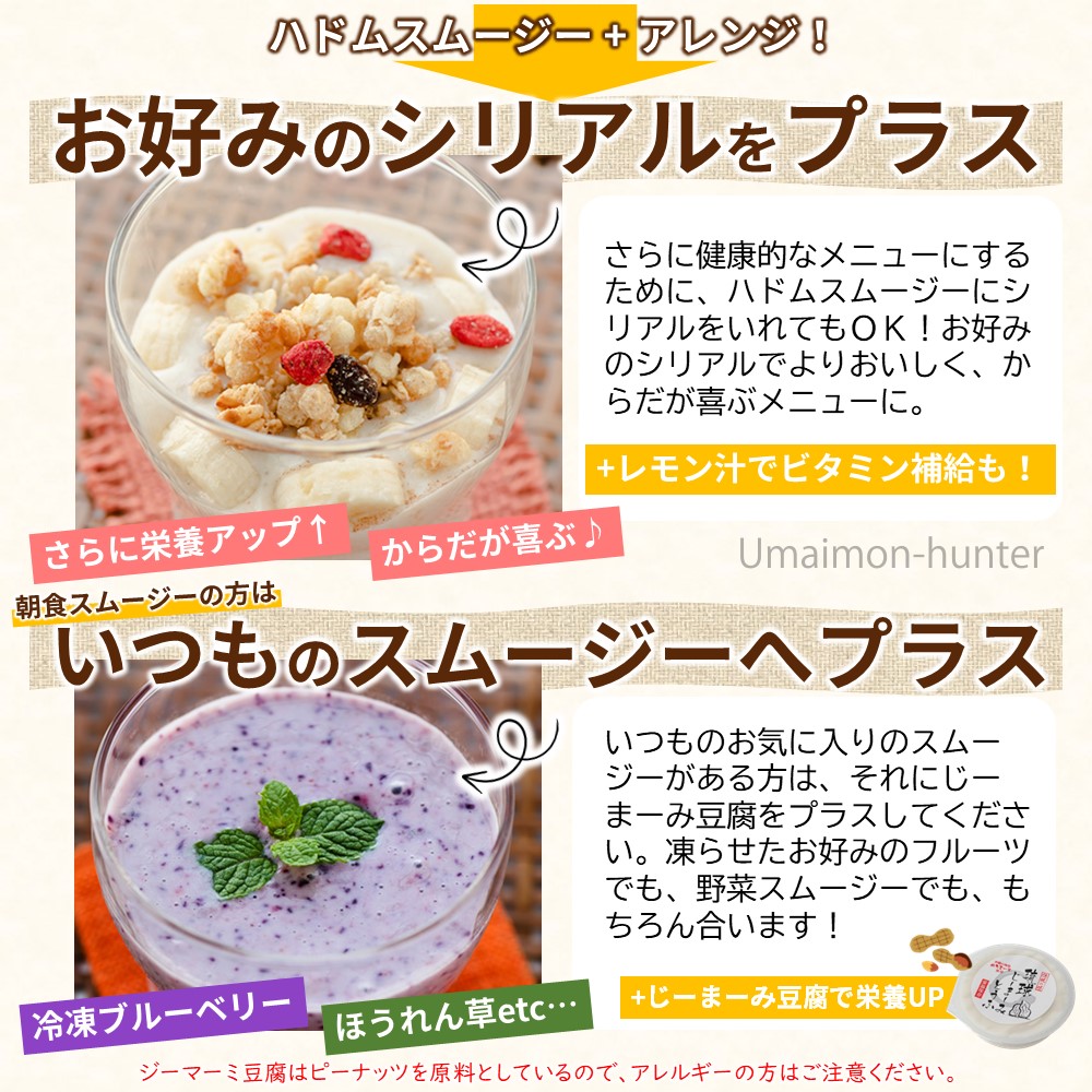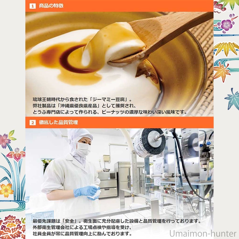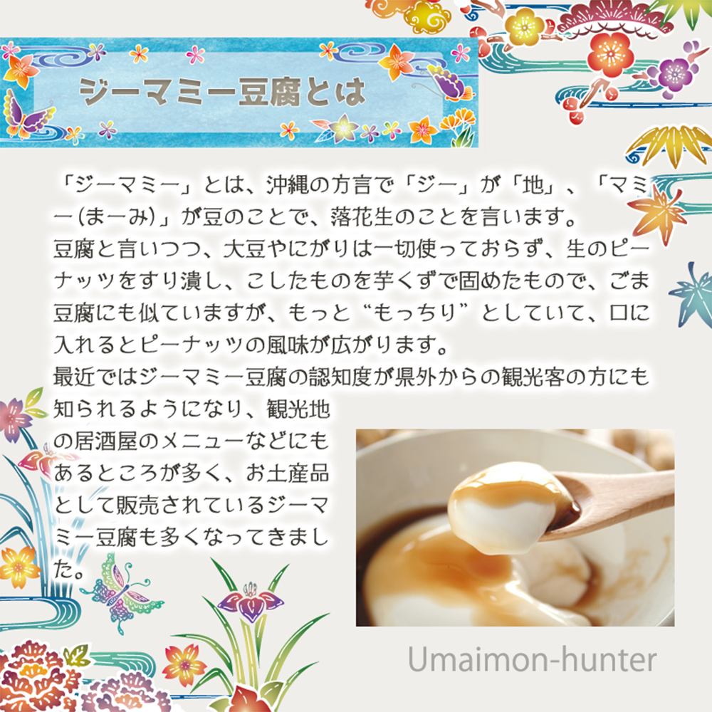 (1食当たり)『ジーマーミ豆腐63g、たれ5g』エネルギー 69kcal、たんぱく質 1.5g、脂質 3.6g、炭水化物 7.7g、食塩相当量 0.4g
