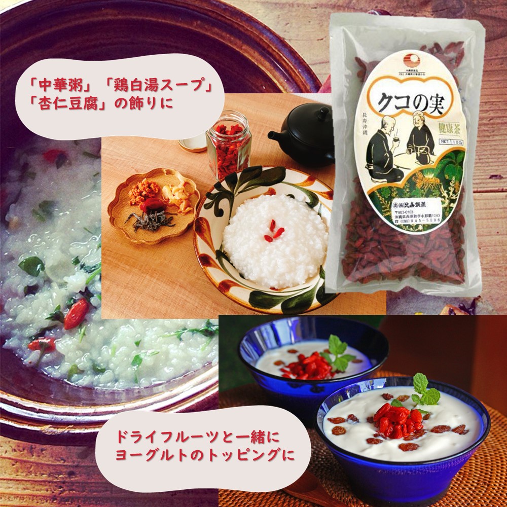お粥やみそ汁の具材に、食後のお茶かわりにクコの実湯とかドライフルーツと一緒にヨーグルトにトッピングすれば、甘酸っぱいデザート感覚で頂けます。