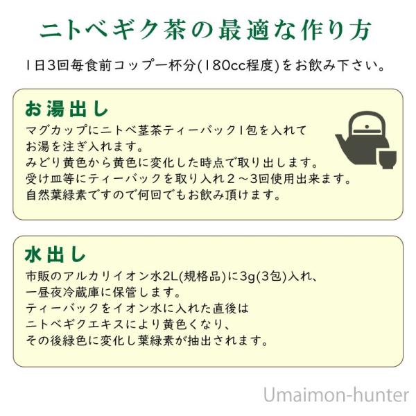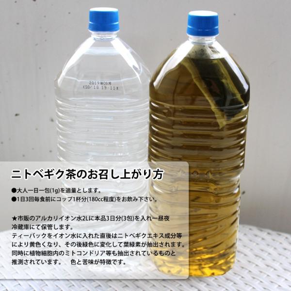 アルカリイオン水(pH値8.8〜9.4アルカリ性)2Lペットボトルに、 ニトベギク茶を3包、1包ずつ丸めて入れてください。 冷蔵庫で4時間から6時間保管すると完成です。 その後も冷蔵庫に保管してください。