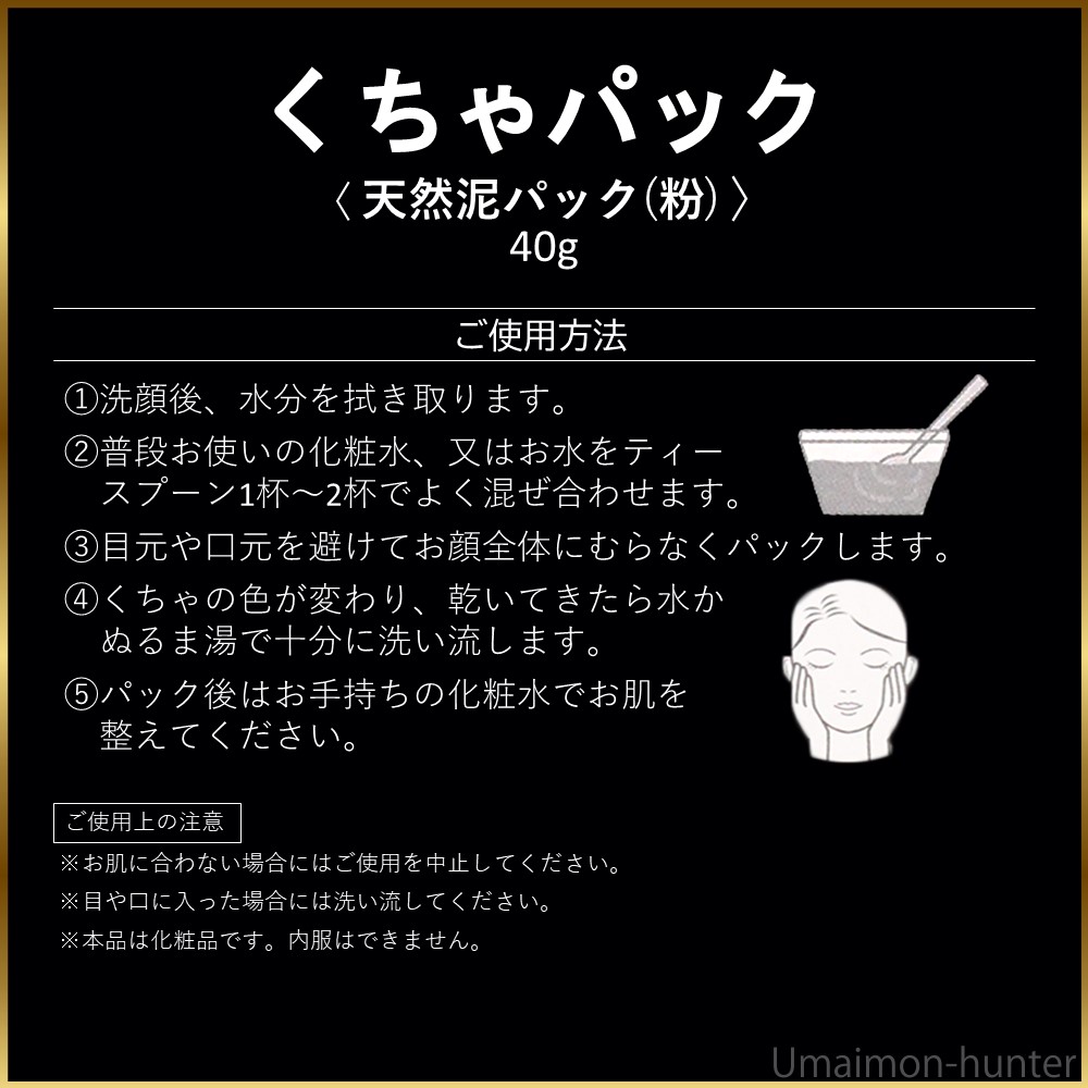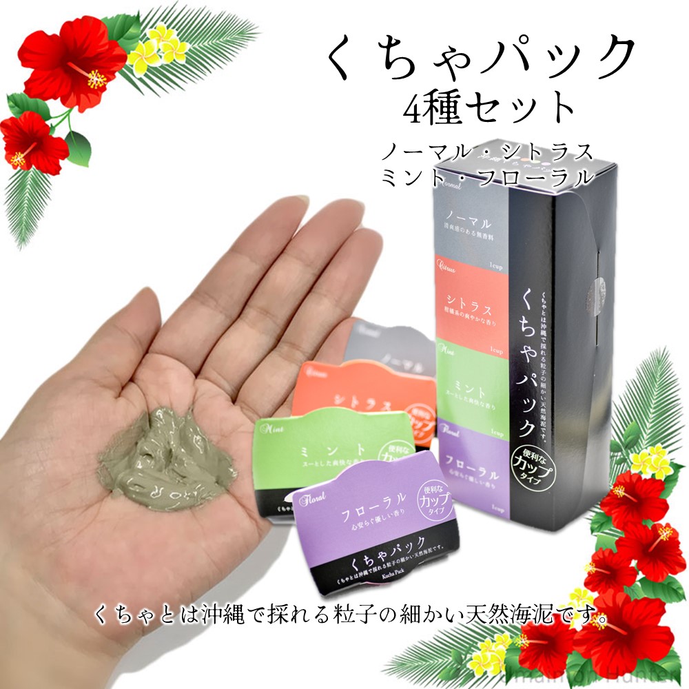 【名称】くちゃパック(天然泥パック粉)【内容量】40g(10g×4カップ)×1箱【全成分】〔ノーマル〕海ソルト〔シトラス〕海ソルト、オレンジ油〔ミント〕海ソルト、ペパーミント油〔フローラル〕海ソルト、ラベンダー油