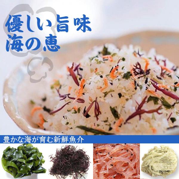湯通し塩蔵わかめ(わかめ(三陸産)、食塩)、金いりごま、食塩、干しふのり、乾燥オキアミ、とろろ昆布(昆布、醸造酢)、海苔、砂糖、(一部にごまを含む)