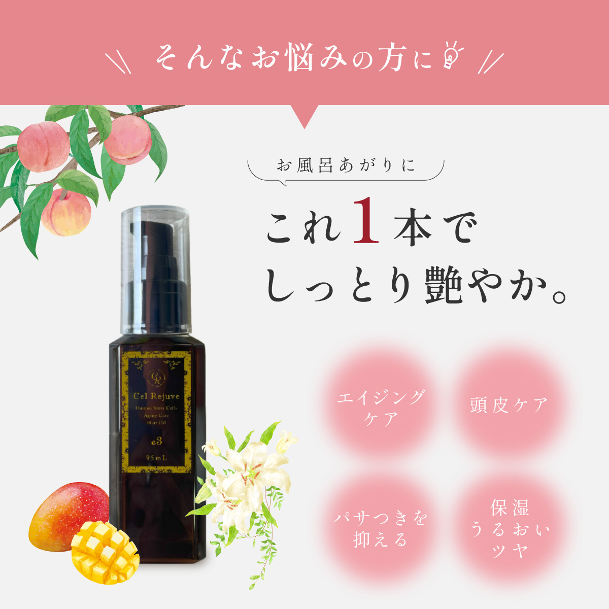 マンゴーピーチ+ホワイトリリーが優しく香る洗い流さないヘアオイルが誕生!