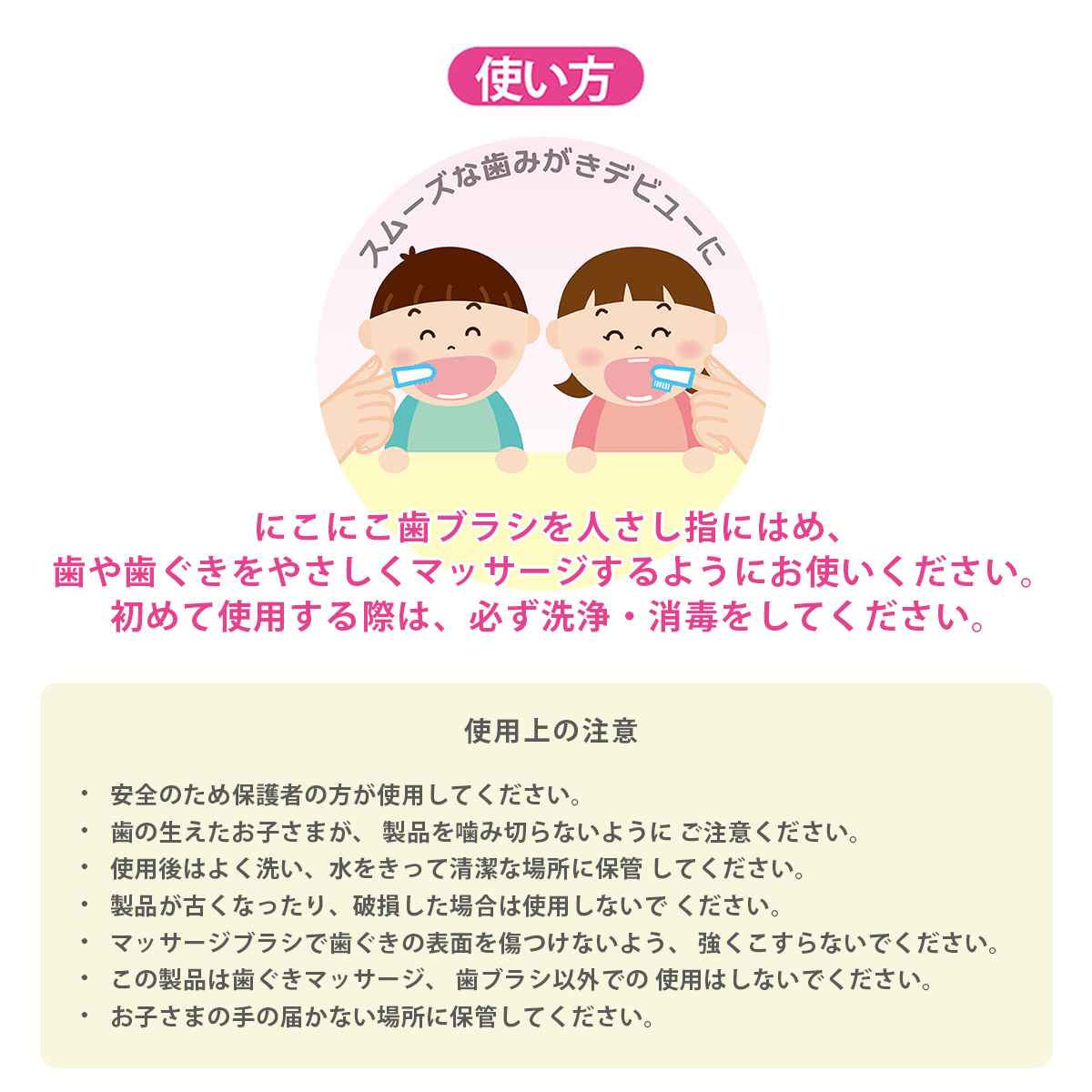 ママやパパの指で赤ちゃんの歯や歯ぐきの状態を確かめながらやさしく口腔ケア。のどをつく心配もなく安心です。スムーズな歯みがきデビューに。