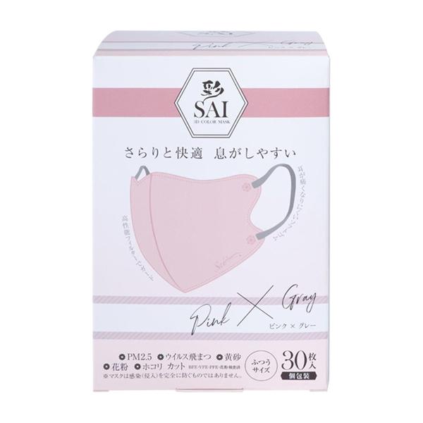 (あわせ買い2999円以上で送料無料)日翔 彩 SAI 立体マスク ピンク&グレー ふつうサイズ 30枚入 個包装