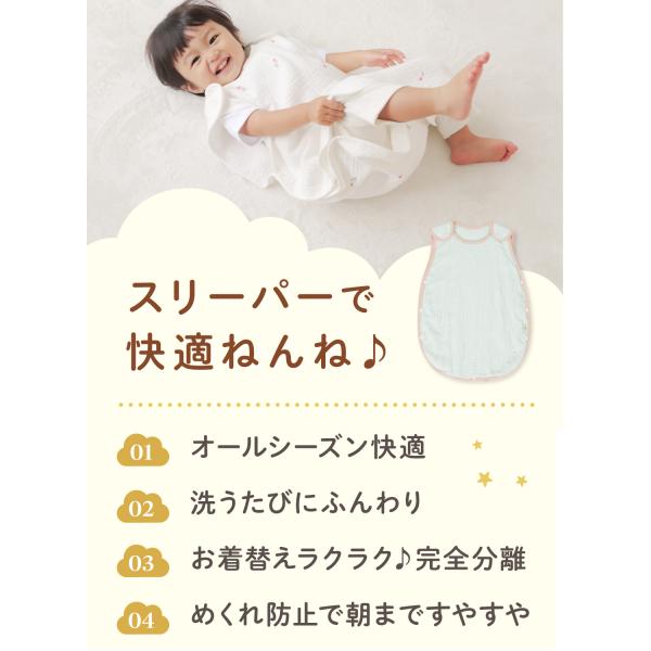 オールシーズン使える4重ガーゼのスリーパー。薄すぎず、厚すぎない4重ガーゼは、体温の高いお子さまの寝冷え対策にぴったりです。