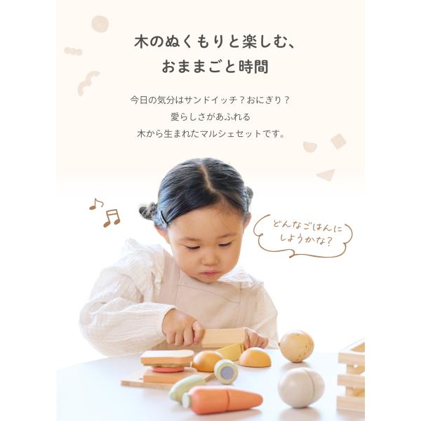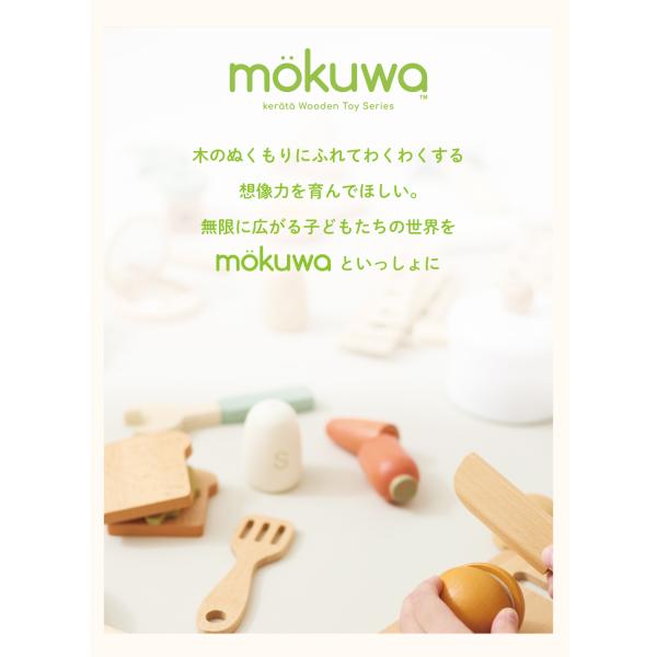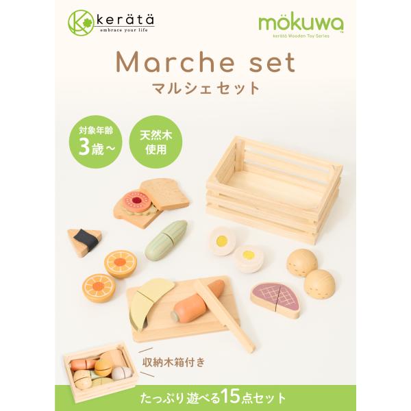 ケラッタの木製おもちゃシリーズ【mokuwa】の野菜や果物が揃った「マルシェセット」。天然木でできたやさしい風合いではじめてのおままごとにぴったり。食材と調理器具が15点揃ってたっぷり遊べます♪