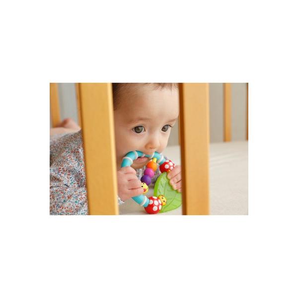 ムシさんがむしゃむしゃ食べる葉っぱの部分は、冷蔵庫で冷やすとクールな歯がために。歯が生え始めの頃のむずむずに気持ちイイ!イモムシのボディはクルクル回るよ!