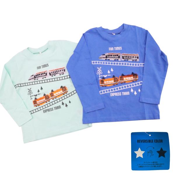 新幹線 電車 スパンコール 長袖 Tシャツ 110cm 120cm 130cm 変色スパンコール ロンT 踏切 リバーシブルカラー 線路 乗り物 男の子 春 秋 キッズ 子供服 トップス