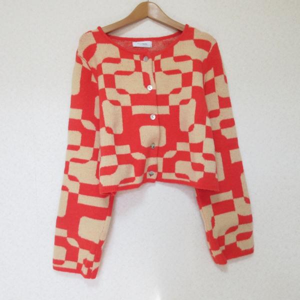 美品 doll up oops ドールアップウップス ニットカーディガン 38 レッド×ベージュ レディース 古着 中古
