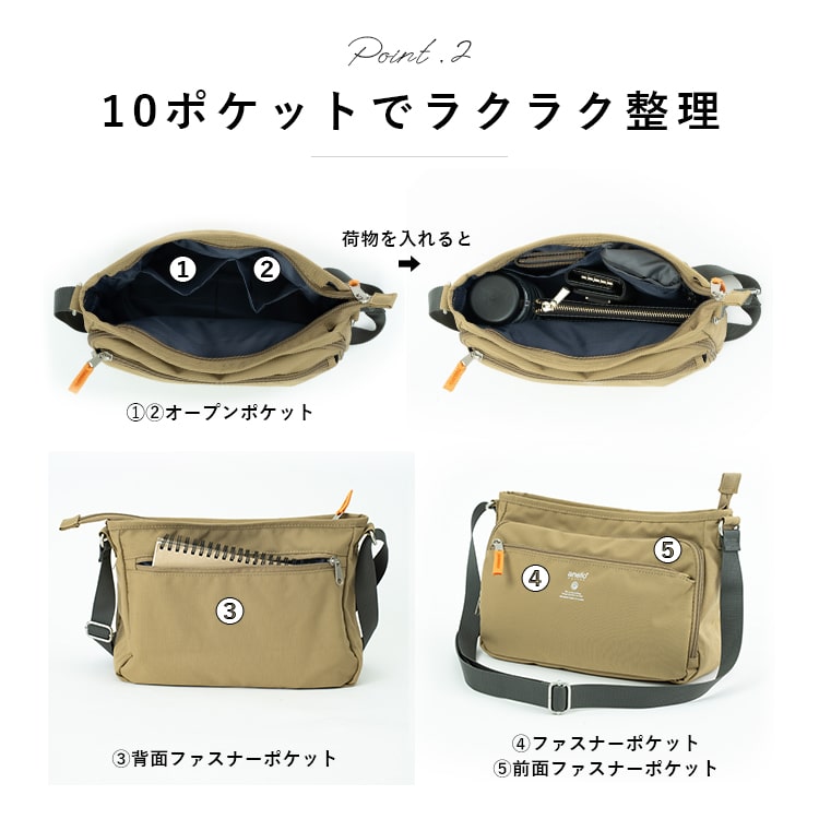 商品名:ショルダーバッグ レディース 斜め掛け 大人 小さめ anello アネロ 両面撥水加工 10ポケット 軽量 かわいい おしゃれ 大人 多機能 多収納 通勤 通学 旅行 プレゼント ギフト