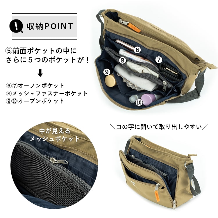 特にコの時に開く正面ファスナーポケットにはメッシュポケットなど収納しやすい部分が色々。