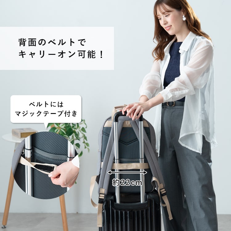 10ポケットで小物の整理もしやすく、背面ベルトでキャリーオンも可。