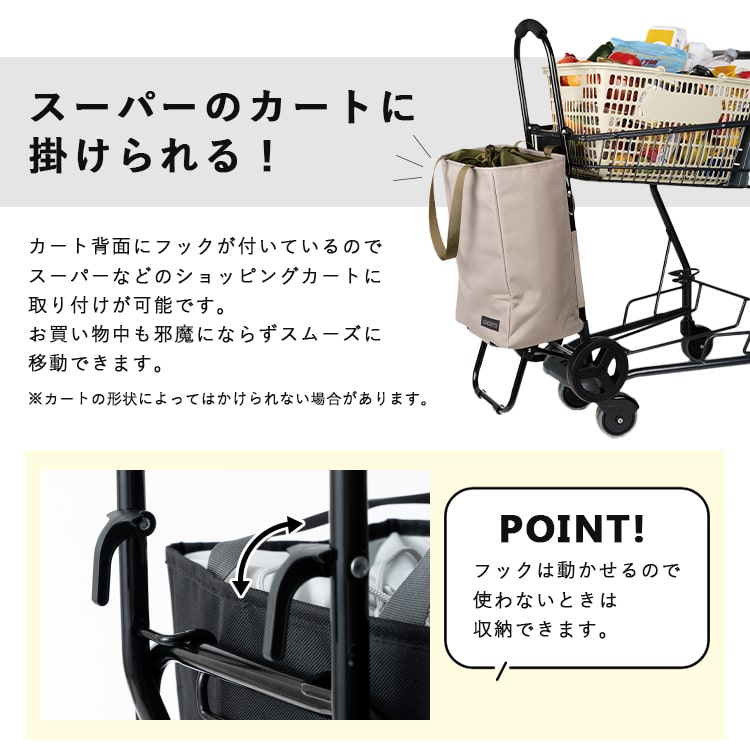 スーパーのカートにかけられるフック付きでお買い物中のカートの置き場に困りません。