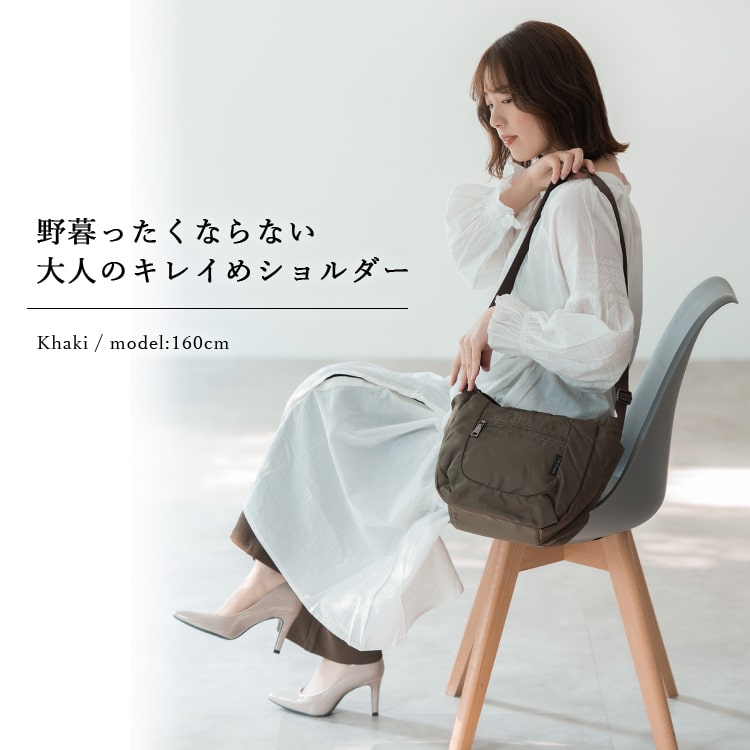 光沢のあるナイロン生地で野暮ったくならない大人のキレイめショルダーバッグ。