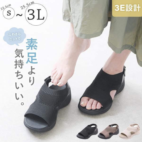 ふわさらニットサンダル 幅広 3E 外反母趾 サンダル レディース ストラップ ローヒール ぺたんこ 歩きやすい 痛くない 柔らかい 軽い 履きやすい おしゃれ 夏