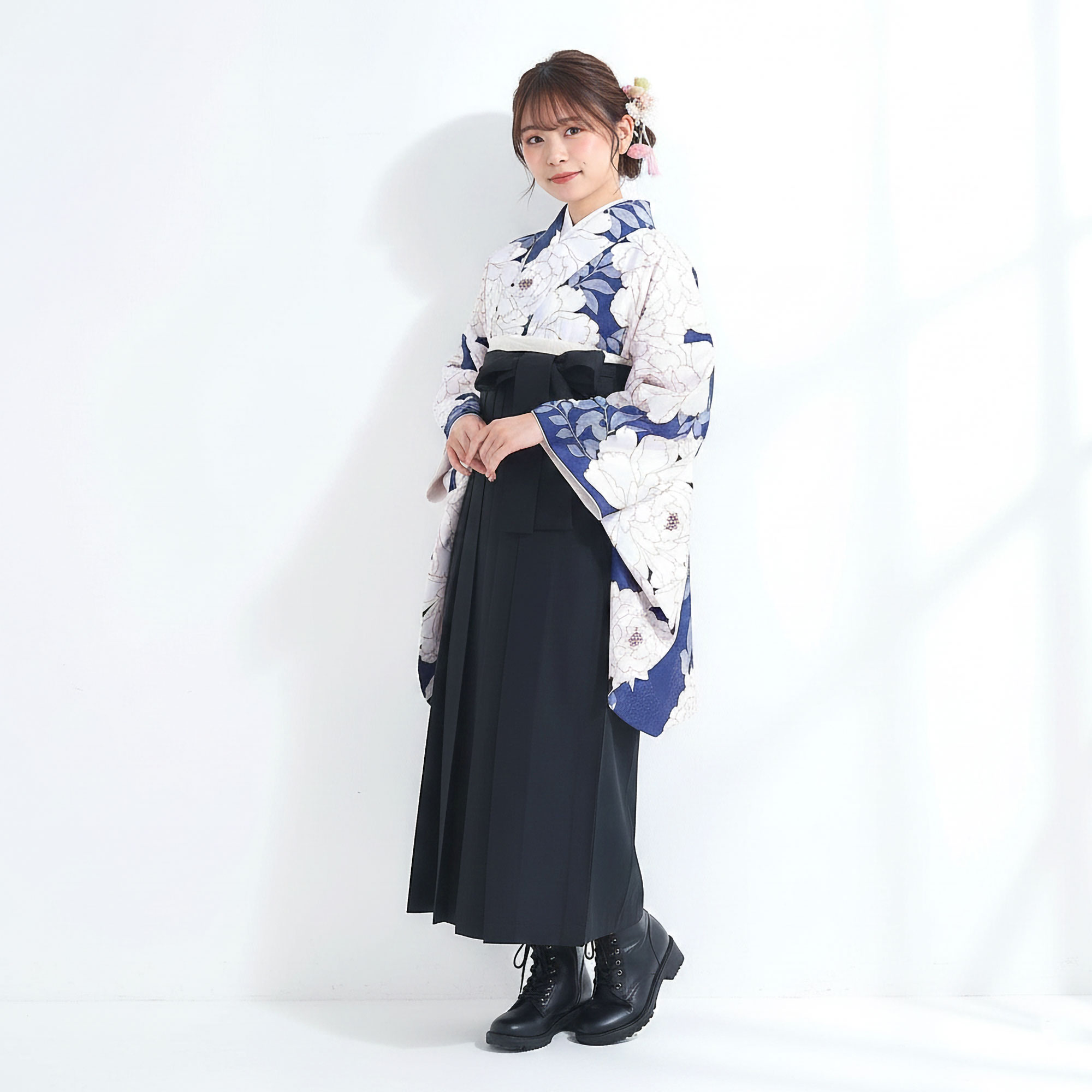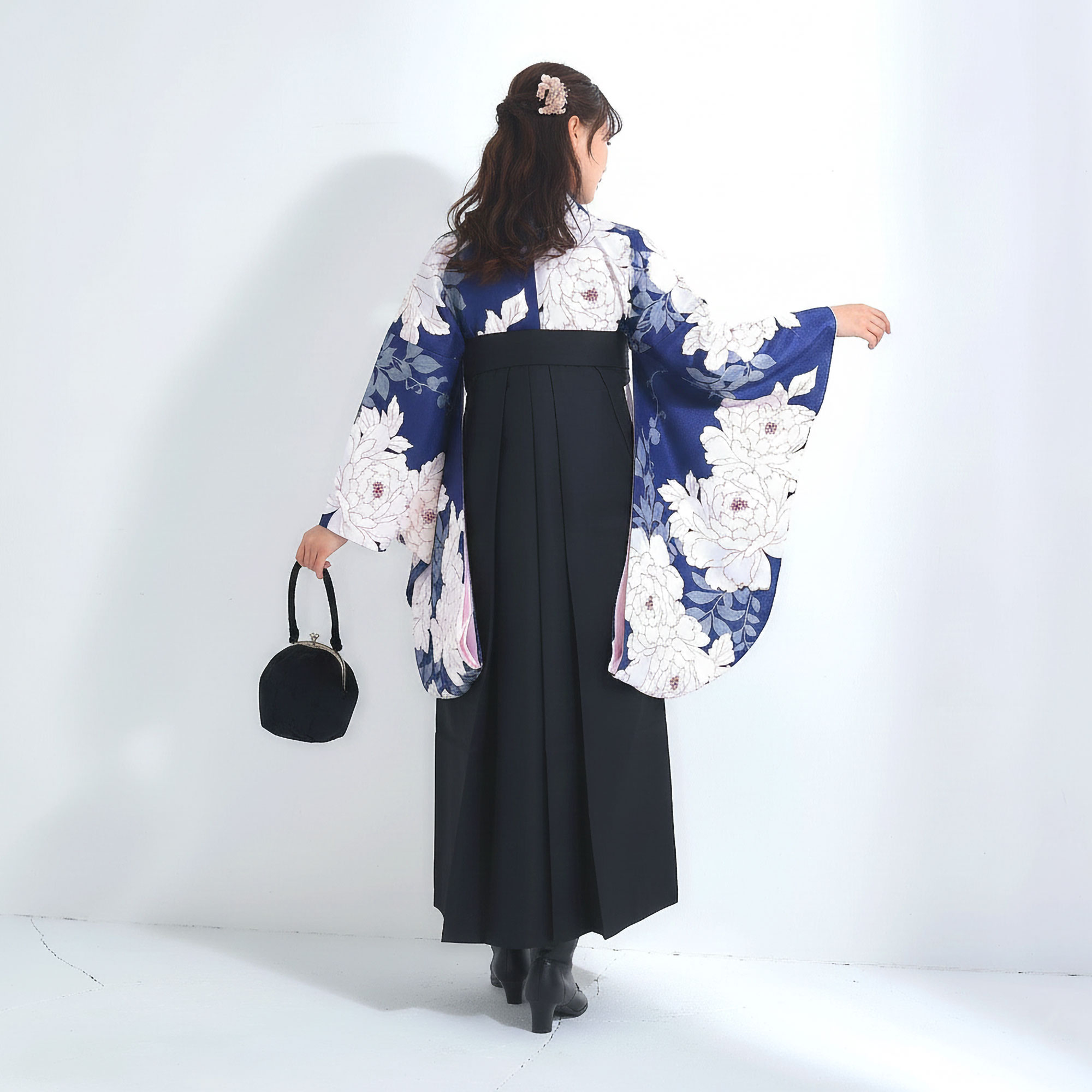 二尺袖 着物 袴 セット レンタル商品 卒業式 大学生 袴 SS S M L LLサイズ 個性派 フェミニン くすみカラー ネイビー 青 ブラック 黒 白 牡丹 No.2178